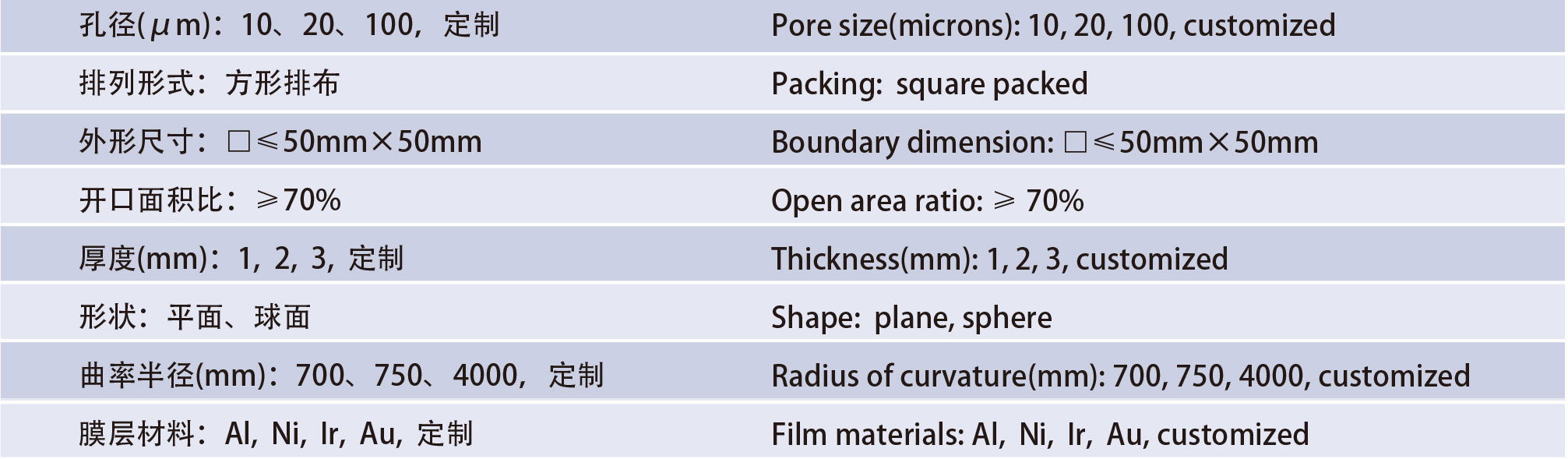MPO是一种可对X射线和紫外等波段光子进行聚焦的掠入射型聚焦光学元件。其是由上百万个微米级尺寸方形微孔组成的玻璃薄片,微孔内壁表面粗糙度在纳米级以下。MPO可分为平面和球面两类,其中球面MPO可对平行光进行会聚,平面MPO可对发散光进行会聚。MPO具有大视场、高分辨率、小体积等特点。为了得到更好的聚焦效果,可在微孔内壁表面镀制反射膜,且针对不同应用波段可选择不同膜层材料。