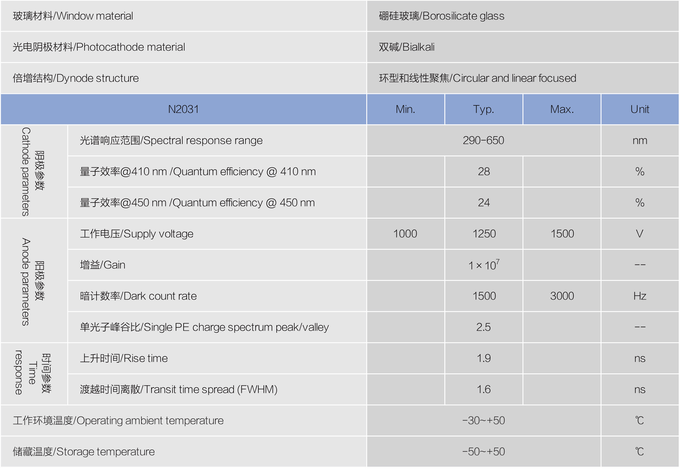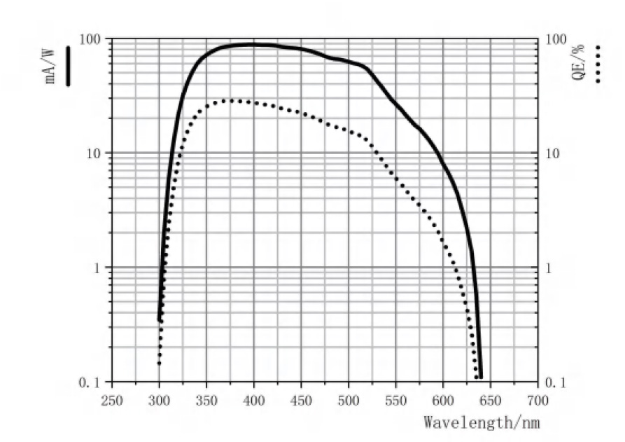 N2031光电倍增管主要应用于高能物理探测领域,具有量子效率高、背景脉冲比例低、时间响应快等优点。本产品采用Sb-K-Cs阴极作为光电阴极,该阴极对350~450nm波段的量子效率高;采用金属打拿极作为电子倍增系统,经过10级倍增后可以达到106电子增益。经过优化后采用紧凑的结构设计,因而具有优越的时间响应。产品性能可以按客户需求订做。