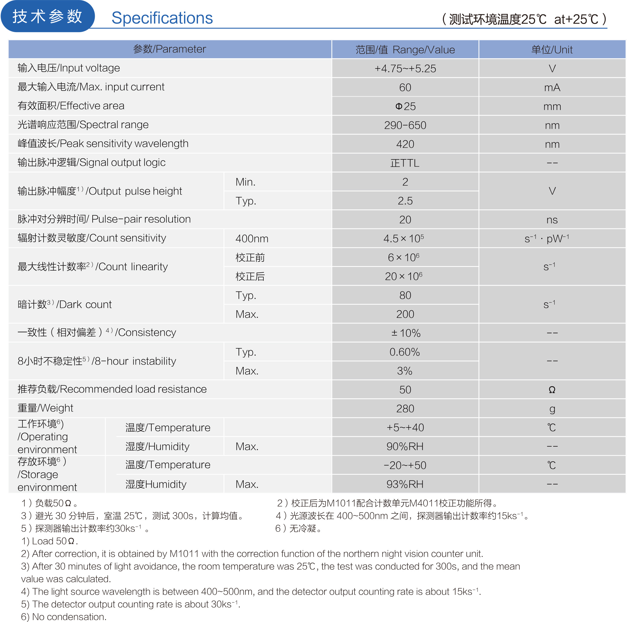 M1011型光子计数器主要应用于生物、医学、化学等多重领域,主要涉及弱光探测、精密测量。本公司研发的M1011型光子计数探测器主要由端窗光电倍增管、高压电源模块、信号成形电路组成。本产品在出厂前,已经过各方面测试,接通电源,将输出端与计数单元连接即可使用。产品性能可以按客户需求订做。
