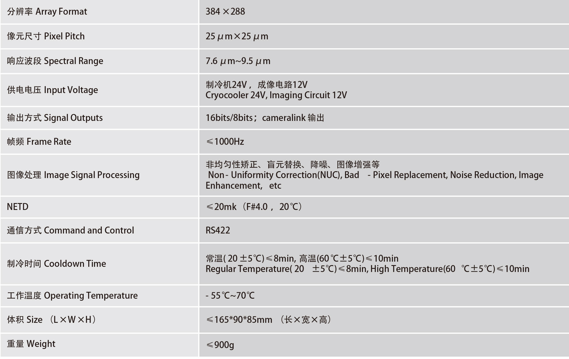 Light weight, high-frame rate with 1000Hz. Compact and lightweight design with high frame rate up to 1000.Applied with digitalized 384x288 LWIR (long wavelength infrared) cooled detector, this imager generates high frequency image up to 1000 frame per second. This product can provide fine-tuned imaging algorithm for a number of military/civilian thermal system includes surrounding scan, thermal sight and airspace surveillance etc.
