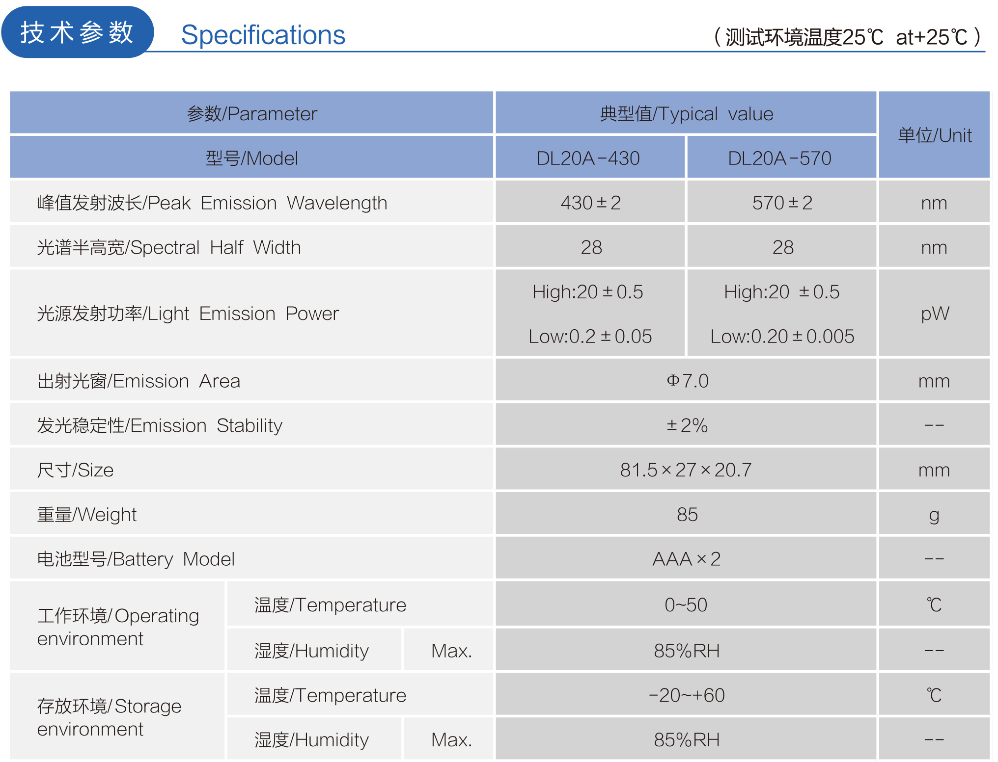 稳定光源可持续输出一定功率的稳定光,主要用于调节光电倍增管及光电倍增管模组的灵敏度,可以直接用于探测器产品的校准、产品检验等用途,也可以用于传递溯源。 DL20A系列稳定光源基于单波长LED,产品内部包含光源模块及光源控制电路,可驱动其输出稳定波长的光。输出波长可选,功率包含强弱档。本系列产品为黑色的金属盒式,由2节AAA电池供电,体积小、易安装,具有可靠性高、不易损坏、单次电池使用寿命长等优点。