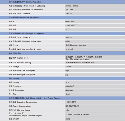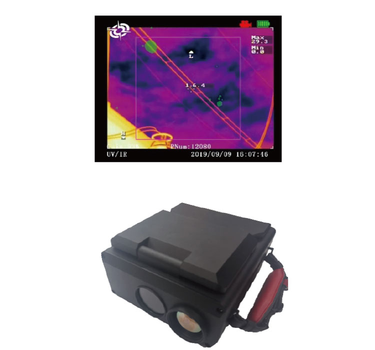 The product adopts solar-blind UV module and infrared temperature measurement module, which can not only detect the weak UV light emitted by voltage-related electrical defects, but also detect the infrared ray emitted by current-related electrical defects. The product has the characteristics of high integration, strong performance stability and high fault determination accuracy. The company's UV, infrared and visible light fusion camera of our company, with a friendly man-machine operating interface and smaller size, can conduct accurate location for the corona, indicate the problem position, measuring the temperature at the fault point ,and assess the condition and seriousness of the problem; additionally, it also can assist inspectors all day in checking the transmission line and equipment of electrical power, factories, railways.