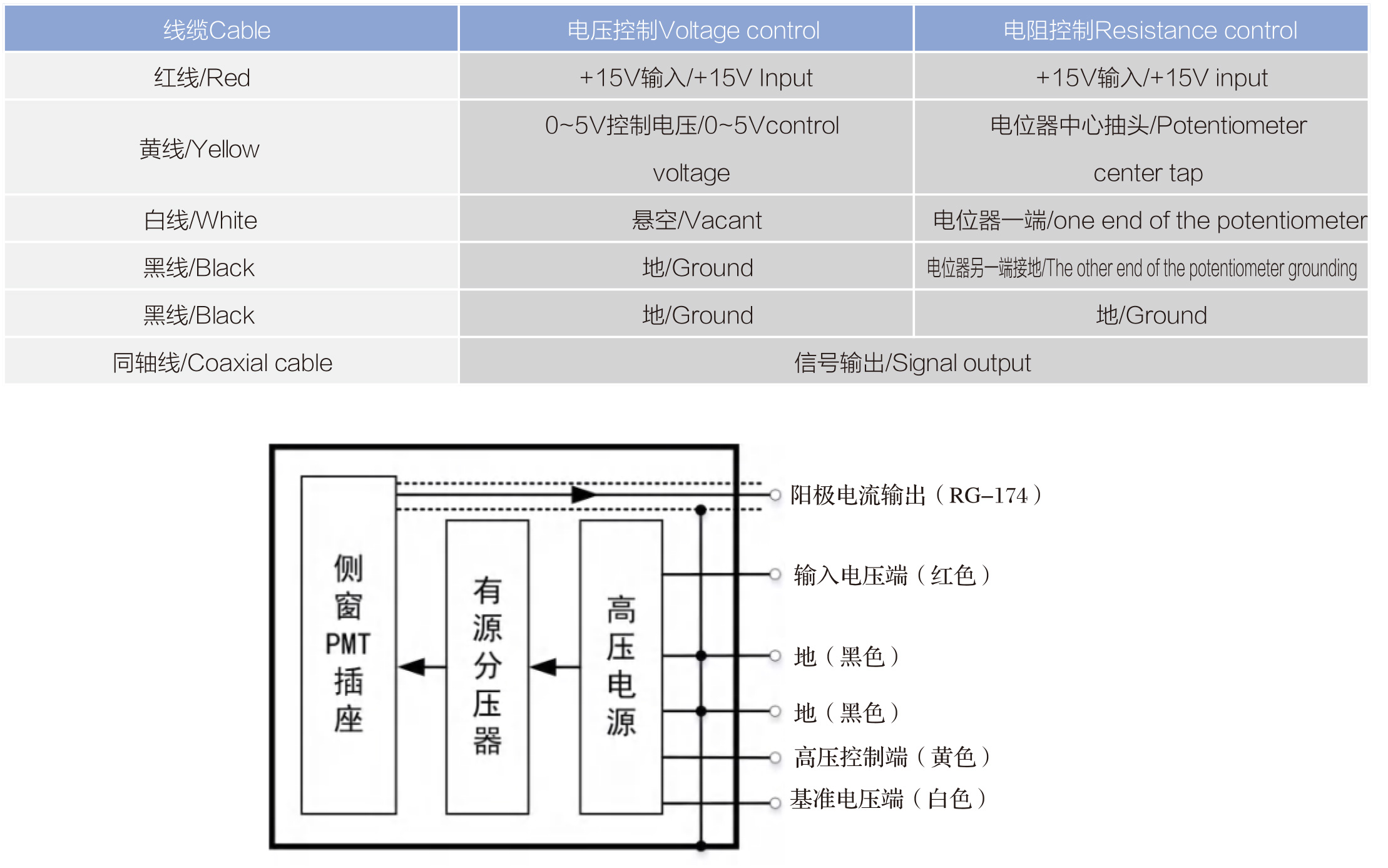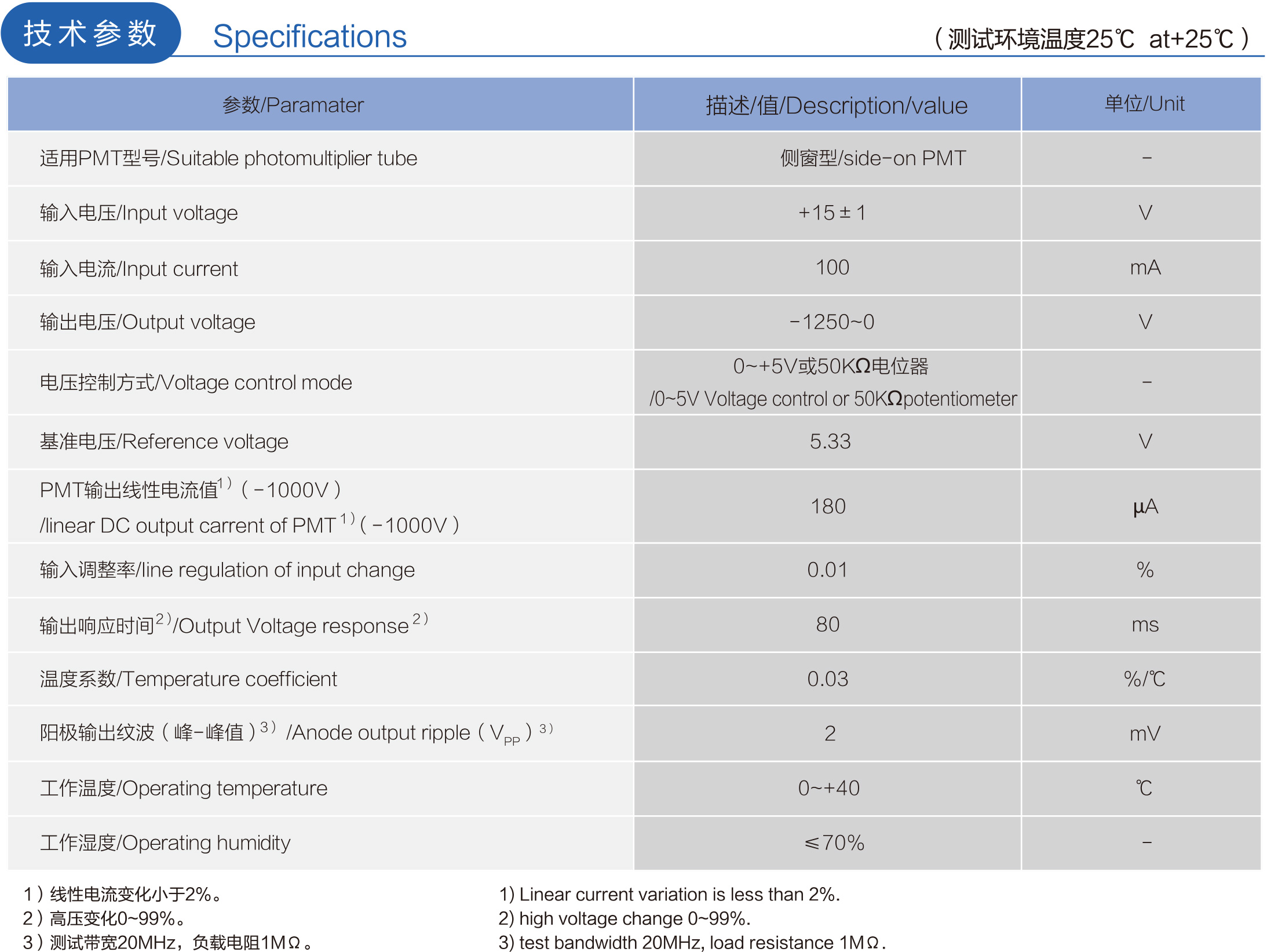 The high voltage power supply socket uses +15V voltage input, 50kΩ potentiometer or 0-5V voltage control, easy to use and convenient. The main feature is that the built-in voltage divider adopts active voltage divider design, which can make the photomultiplier tube have high DC output linearity. This product is suitable for side-on photomultiplier tube, which has the advantages of high linear DC output, wide output voltage range, fast response speed, low ripple noise and so on.