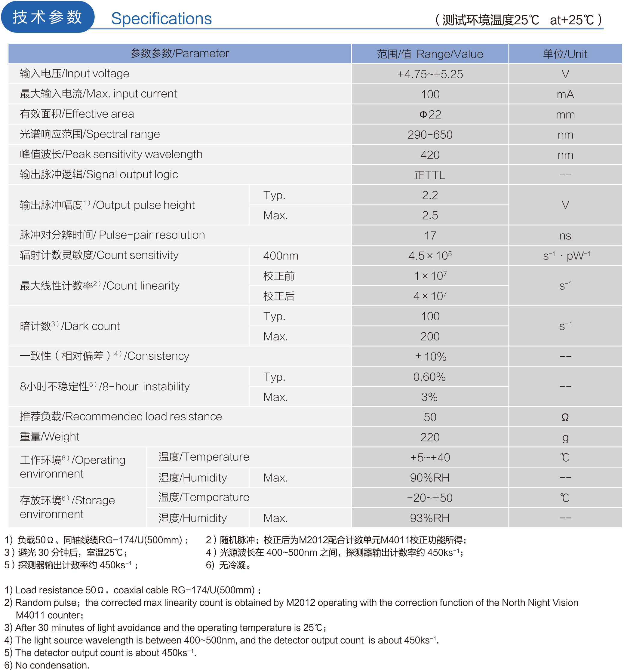 The M2012 photon counting detector is a high sensitivity photon technology detector which is composed of head-on photomultiplier, high voltage power supply module and comparative forming circuit. All parameters are set to their optimun values before the products leaves the factory.The user simply needs to switch on the power,connect the output to the counting unit.