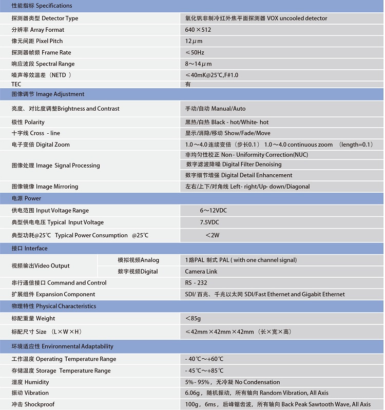通用小巧,清晰成像。 非制冷640×512-12μm机芯组件,采用国产氧化钒非制冷焦平面探测器,配备专业的成像及图像处理电路,成像清晰,支持多种视频接口,满足安防监控、车载夜视等行业应用需求。